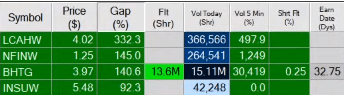 After watching his watch list video for the day, I knew which stock I was going to be focusing on. The picture below shows the top four leading gapers for Monday morning at 8:27 am Central Time. With three minutes remaining until the market opened, the only one that made the most sense to me to trade was BHTG. BHTG, at the time was gapping up 140.6% with 15.11M shares of volume. It was in the price range that I was shooting for with this small account that had just south of $1000, so I knew that I would safely be able to get 200 shares.