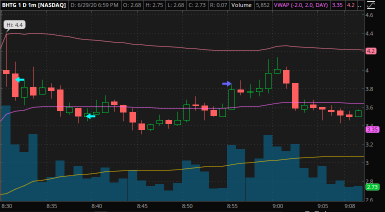 I bought 100 shares of BHTG at $3.90 per share for a total of $390.00. Even though I saw that the stock started to go down I wasn’t panicking for the fact being for every cent that the stock went down I was only losing $1.00, so I found solace in that fact that I had some room to play with. I knew that I was also able to get 100 more shares so I could use what is called averaging down, which will lower my take profit point. I continued watching what the BHTG stock was doing and at 8:39 am Cental Time I picked up 100 more shares at a price of $3.50 per share for a total of $350.00, which makes my whole position 200 shares of BHTG at an average price of $3.70 per share. I have marked in the screenshot below in light green, the two points when I picked up shares and in dark green when I sold all my shares. I held my position for less than 30 minutes and at 8:55 am Central Time I sold all 200 shares for a price of $3.85 per share which made for a profit totaling $30.00. It’s not much but for the time that I put in and for the fact that my account is so small I will take any profit over a loss. It’s the small wins that will grow this account, I would rather take base hits than try and swing for a homerun and miss and lose money.