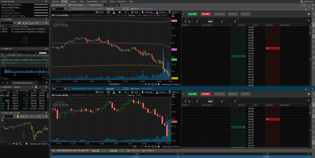 About a week ago at the end of June I felt that it was time that I try my hand in what I really wanted from this account which was day trading. I had just south of $1,000 in my account that wasn’t held up in stocks so I decided to give it a shot! I had been using the thinkandswim paper money account to practice. If you are interested this is how I recommend starting out because if you lose its technically not real money so there is nothing really lost but everything gained because the experience is the most valuable part of using the paper money. I had been using paper money for three months and it was time to put everything that I have learned into action.