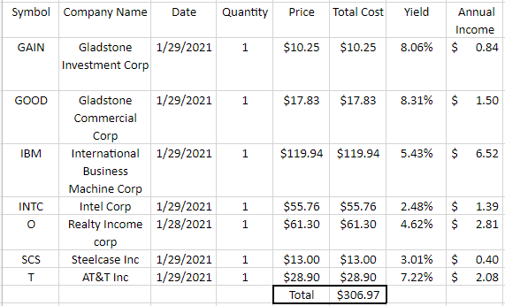 I wanted to add at least one stock that previously would have not be attainable because my weekly amounts didn’t give me the chance to. I’m still pushing to get my portfolio more balanced so I’m not leaning too heavily in one sector. I feel that what I added this week (IBM, INTC, O, SCS) helped me rebalance it out, however much more still needs to be done. GAIN and GOOD are going to help increase my monthly income followed by T which is going to help with my overall annual income.